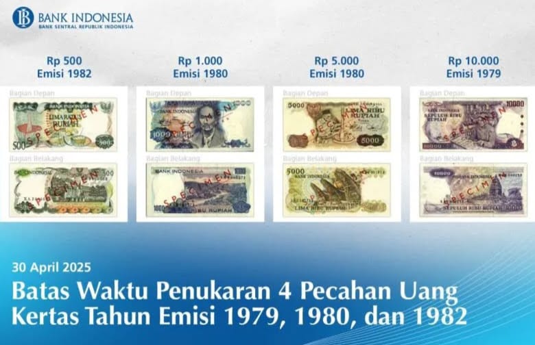 "Keempat pecahan uang kertas dimaksud antara lain uang kertas pecahan Rp10.000 Emisi 1979; uang kertas pecahan Rp5.000 Tanda Tahun 1980; uang kertas pecahan Rp1.000 Emisi 1980; serta uang kertas pecahan Rp500 Tanda Tahun 1982," kata Direktur Eksekutif Departemen Komunikasi BI Ramdan Denny Prakoso, dilansir dari Antara, Rabu (30/04/2025).
